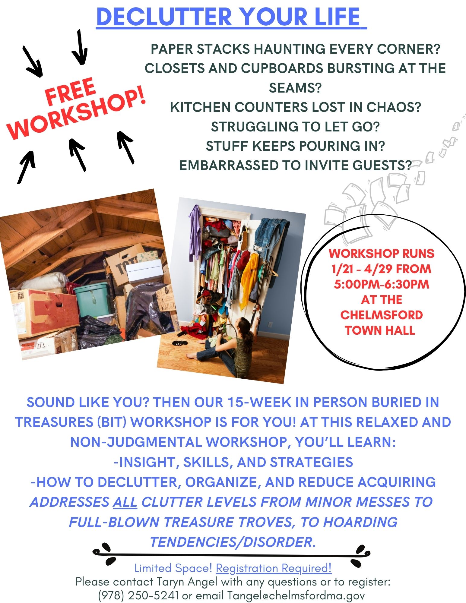 Join our transformative 15-week "Buried in Treasures" workshop, designed to equip participants with valuable insights, practical skills, and effective strategies for decluttering, organizing, and minimizing new acquisitions. This comprehensive program welcomes all levels of clutter, from minor messes to severe hoarding disorder. Through engaging sessions, participants will learn to tackle their clutter challenges, develop sustainable habits, and create a more organized and serene living environment. Whether you're dealing with a few extra items or a significant accumulation, this workshop offers the support and tools you need to reclaim your space and peace of mind. Registration required.
