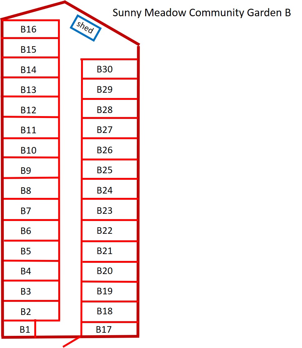 - Garden B is adjacent to Garden A and across from the garden shed. Garden B has 30 plots, approximately 450 sq ft (13' x 34.5'). Fee: $50/year ($25/year for half-plot). Garden B Map