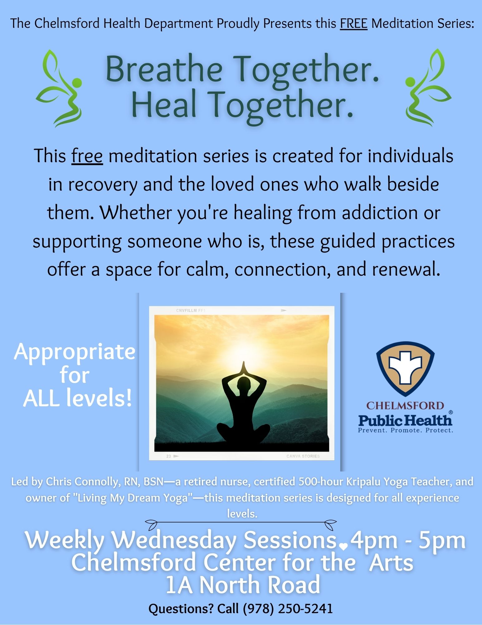 The Chelmsford Health Department is proud to offer Breathe Together. Heal Together, a free, inclusive meditation series created to support healing, connection, and well-being within our community.