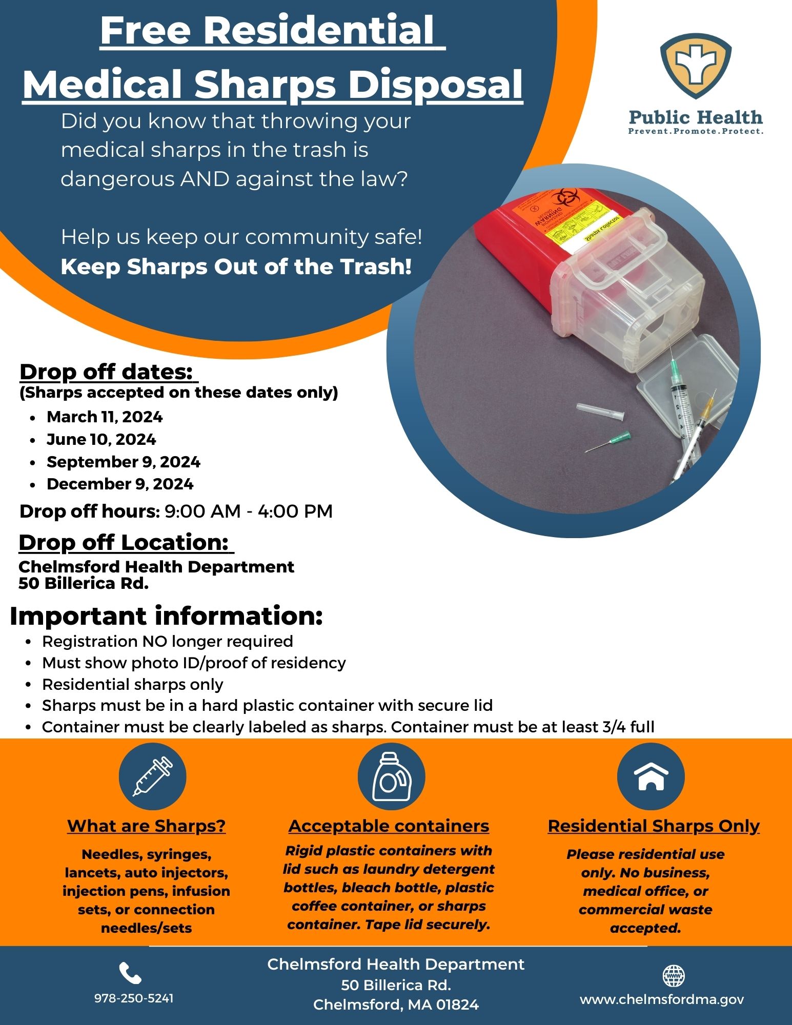 Drop off your medical sharps to the Chelmsford Health Department. Proper sharps disposal is important for keeping our community safe. All residents are eligible and do not need to register. Please bring your sharps in a hard plastic container with a lid. Sharps not in proper containers will not be accepted.