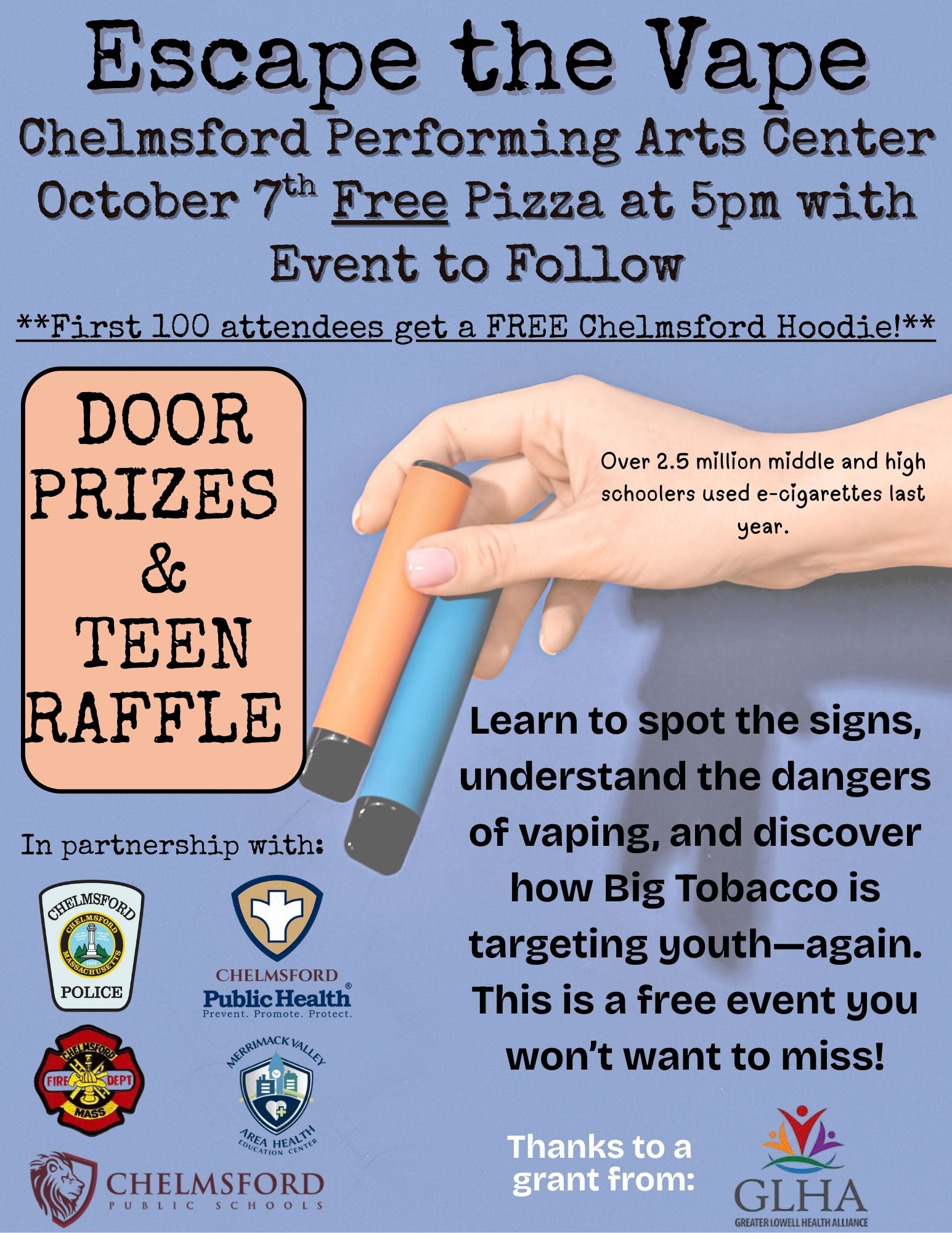 The Chelmsford Health Department invites parents, teens, educators, and community members to the Escape the Vape Symposium on Tuesday, October 7 at 5:00 PM at the Chelmsford Performing Arts Center. This free event will raise awareness about the dangers of vaping and empower families with practical strategies for prevention.